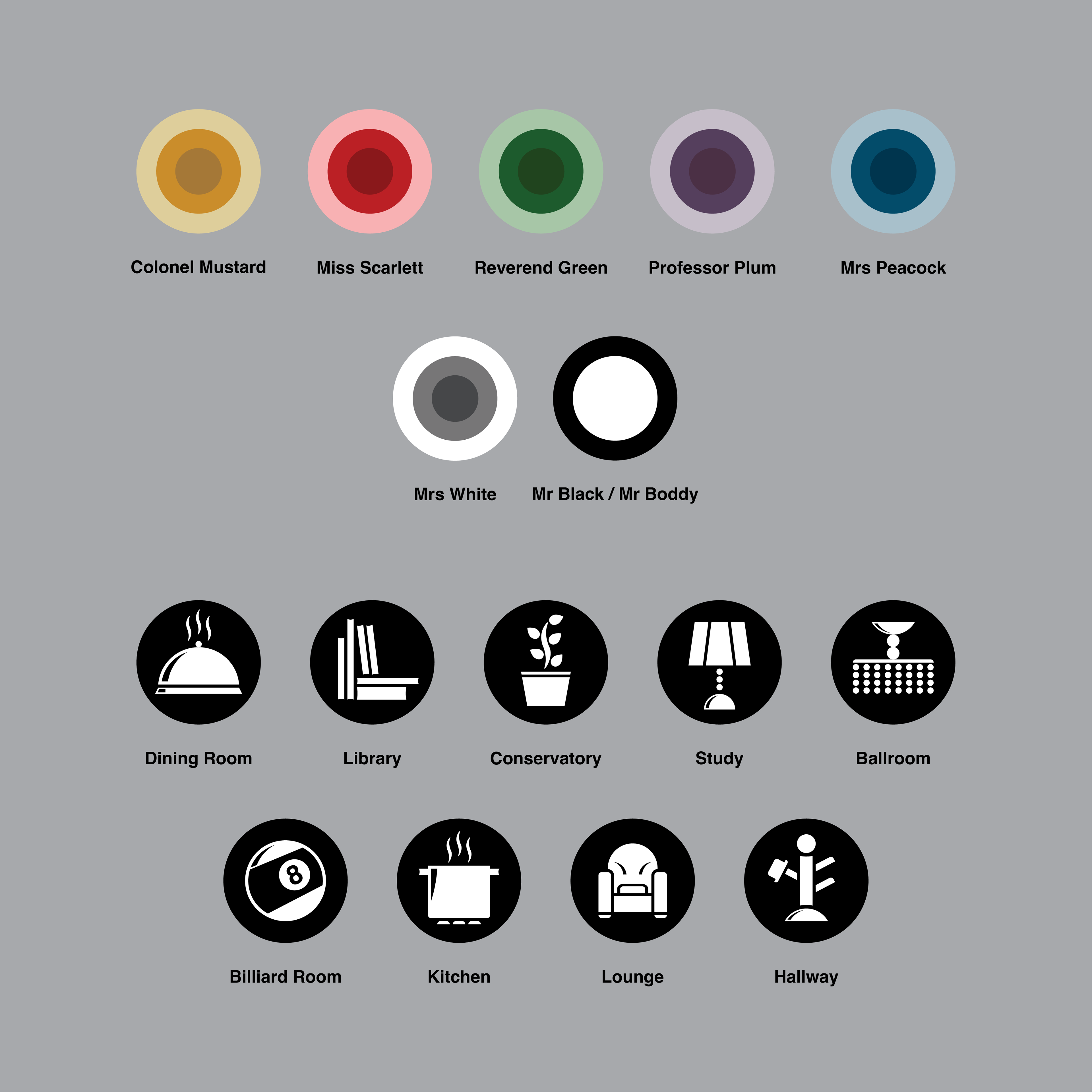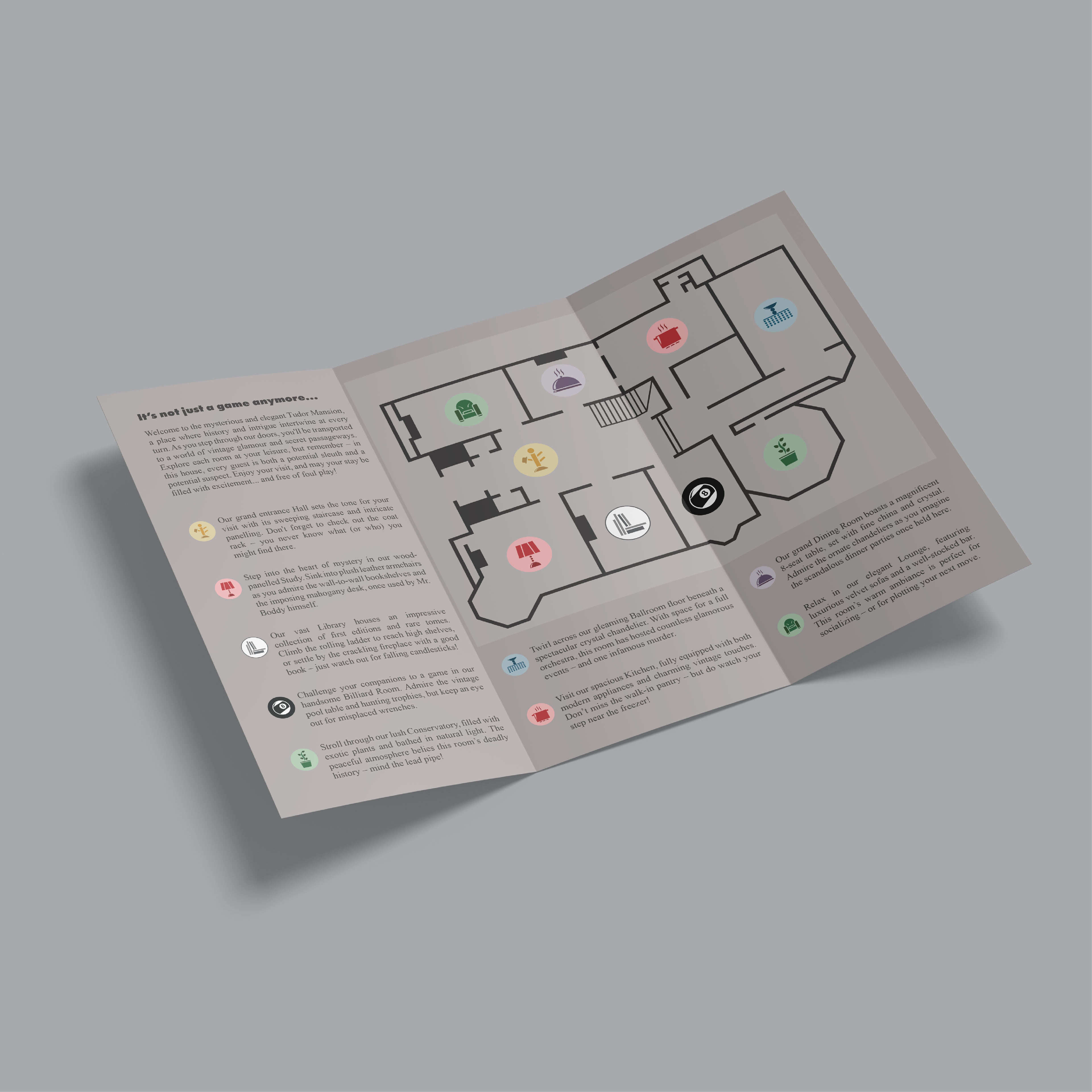 The objective for this project was to create a cohesive set of scalable icons. Each icon represents a room from the movie/game "Clue", with the use of similar shapes and consistent sizing providing unity across the set. What if the mansion really existed and was open to the public? With a subtle nod to the characters' colours, the icons are used in a promotional brochure guiding visitors through the fictional mansion.
